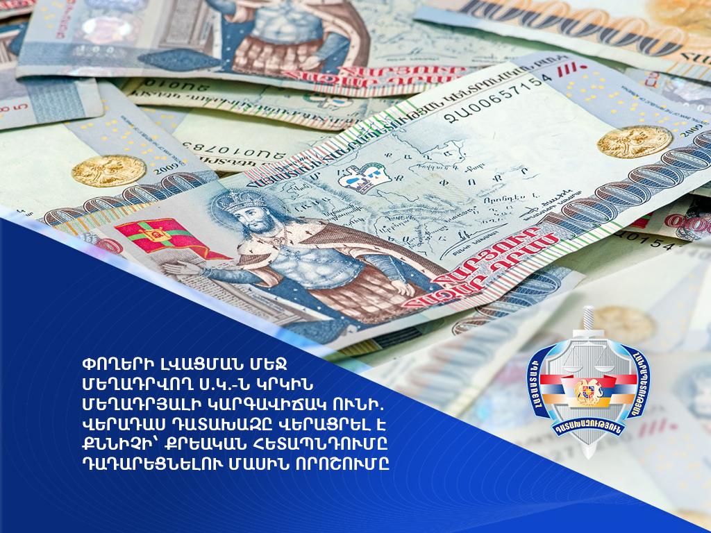 Նախաքննության ընթացքում՝ 2020 թվականի ապրիլի 13-ին, Ս.Կ.-ին մեղադրանք է առաջադրվել 18.04.2003 թվականին ընդունված Քրեական օրենսգրքի 178-րդ հոդվածի 3-րդ մասի 1-ին կետով (առանձնապես խոշոր չափերով կատարված խարդախություն) և 190-րդ հոդվածի 3-րդ մասի 1-ին կետով (հանցավոր ճանապարհով ստացված եկամուտներն օրինականացնելը, փողերի լվացում): Որպես խափանման միջոց՝ կիրառվել է ստորագրություն չհեռանալու մասին: Առաջադրված մեղադրանքում Ս.Կ.-ն իրեն մեղավոր չի ճանաչել: 2021 թվականի դեկտեմբերի 17-ին որոշում է կայացվել Ս.Կ.-ի նկատմամբ քրեական հետապնդումը դադարեցնելու և նրա նկատմամբ կիրառված ստորագրություն չհեռանալու մասին խափանման միջոցը վերացնելու մասին՝ նրա արարքներում հանցակազմի բացակայության հիմքով: